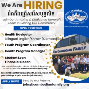 Please submit both cover letter stating why you believe you are the best candidate for this position and resume to jobs@cambodianfamily.org or mailing address: 1626 E. 4th Street, Santa Ana, CA 92701.